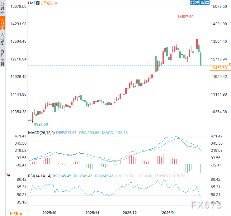 汇通财经APP讯——周一(2月2日)亚欧时段,铜价延续此前从创纪录高位持续大幅下跌的趋势,LME铜上周四一度触及14527.50美元/吨的历史新高,而后大幅回落,现交投于12460美元附近,日内跌幅约5.3%;沪铝上周五一度刷新114160元/吨的历史新高,现交投于98580美元,日内跌幅约9%。令交易员们争论在几天的混乱交易冲击全球金属市场后,看涨的投资者是否会重新入场。