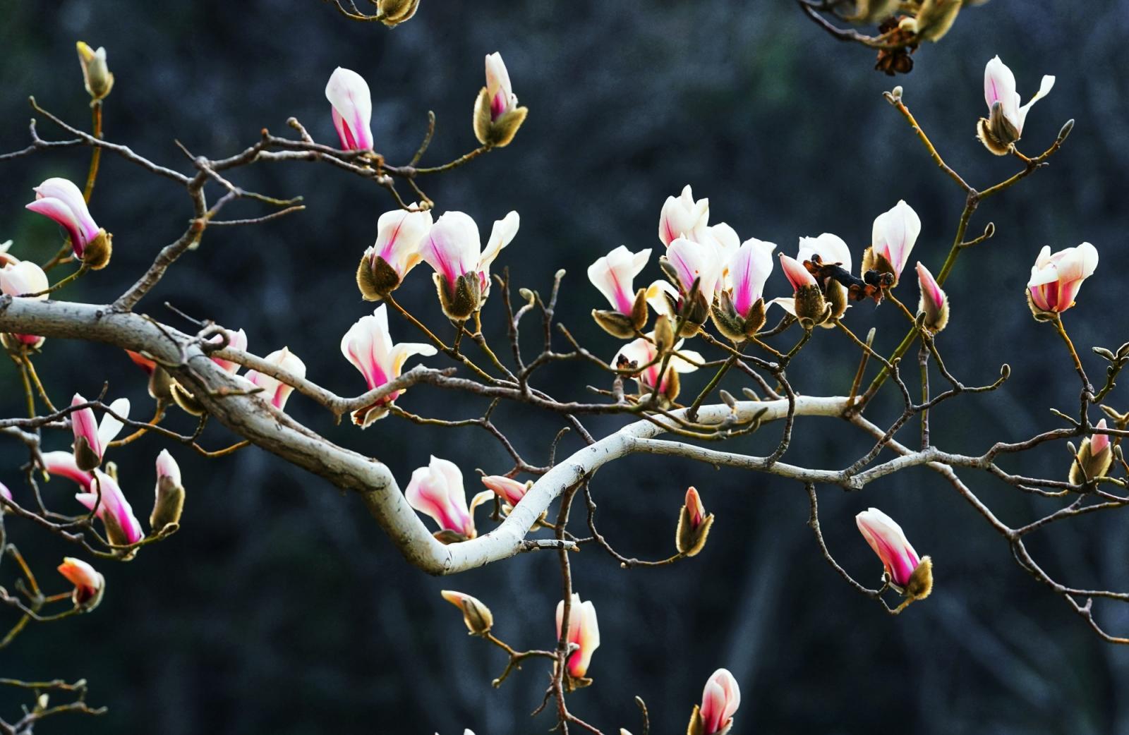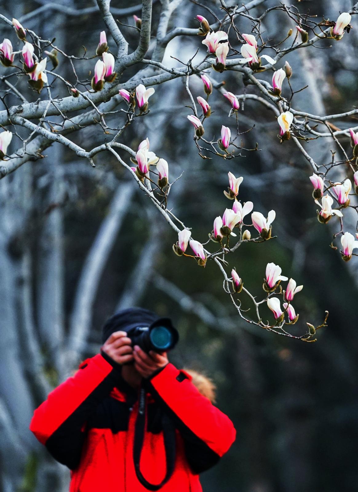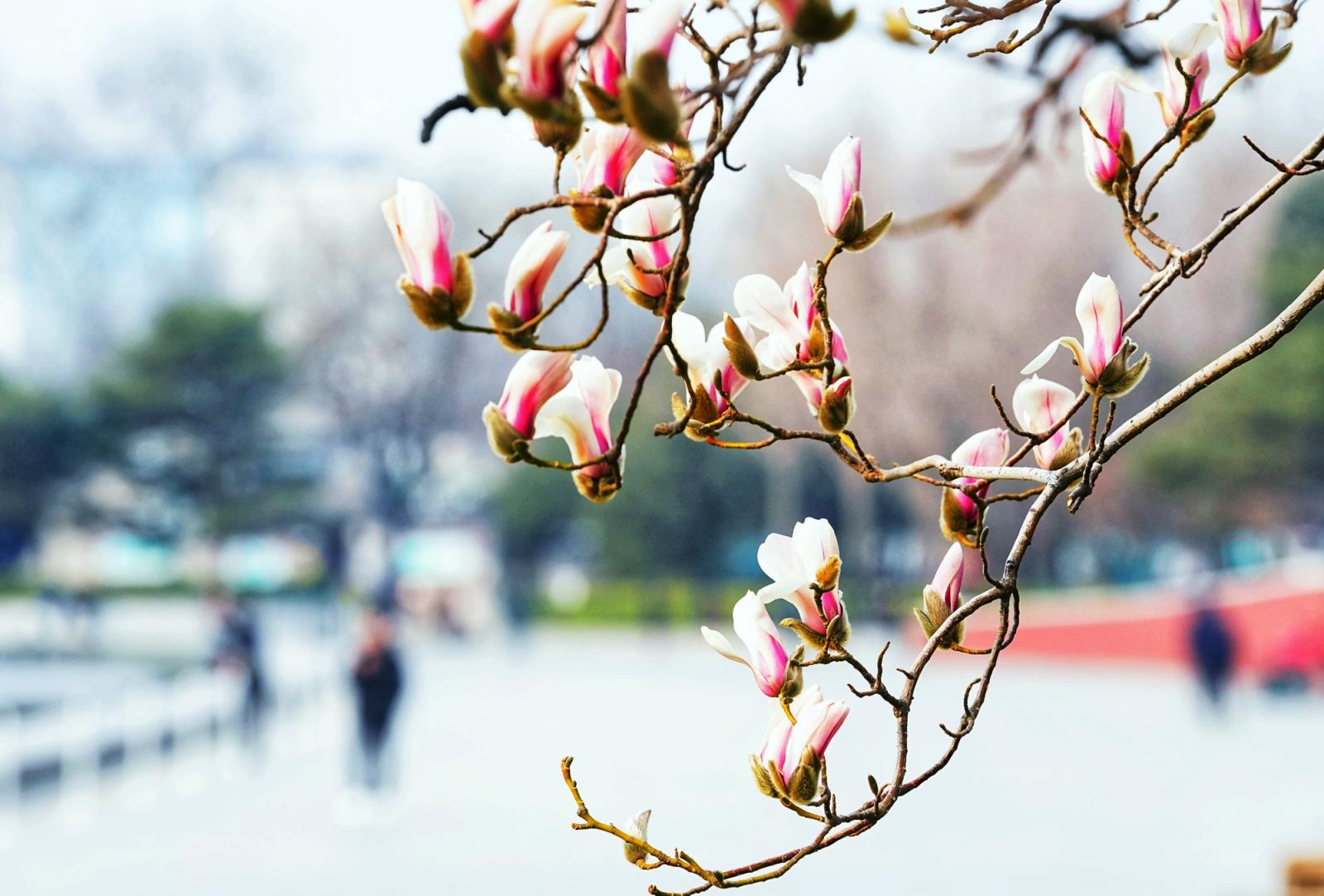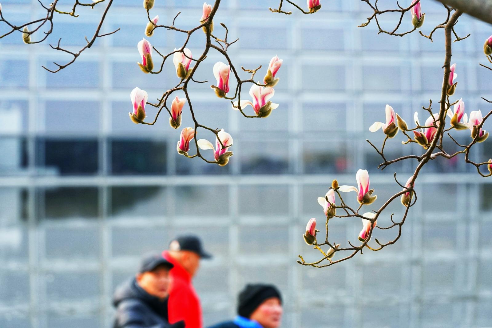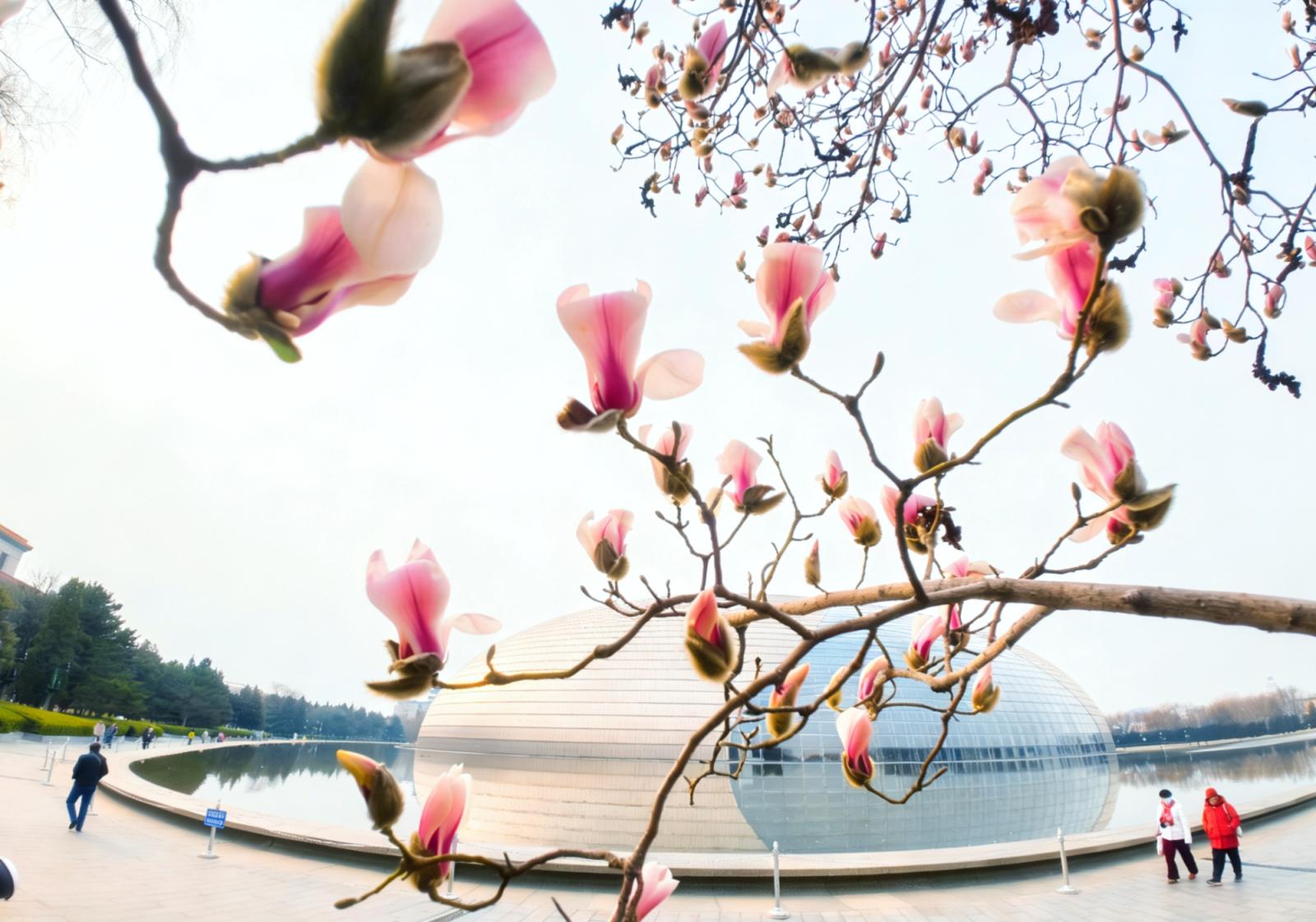 随着春意渐浓,首都处处生机勃发。国家大剧院前,数株玉兰携春风悄然绽放,花瓣轻舒,粉紫与洁白相间,清雅脱俗,为庄严大气的京城增添一抹温婉灵动的盎然春意。