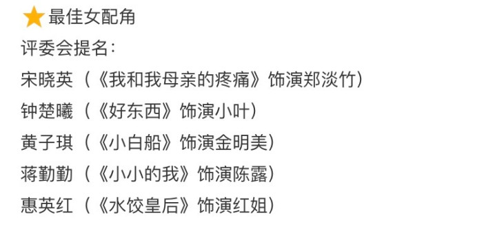 最佳女配角提名的几位包括:宋晓英、钟楚曦、黄子琪、蒋勤勤、惠英红。