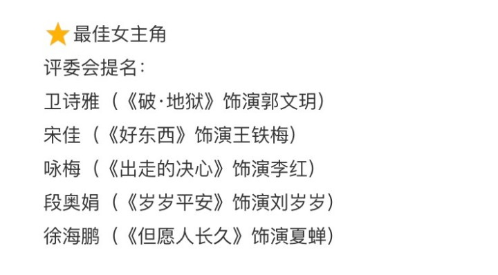 提名最佳女主角的五位是:卫诗雅(《破·地狱》饰郭文玥)、宋佳(《好东西》饰王铁梅)、咏梅(《出走的决心》饰李红)、段奥娟(《岁岁平安》饰刘岁岁)、徐海鹏(《但愿人长久》饰夏蝉)
