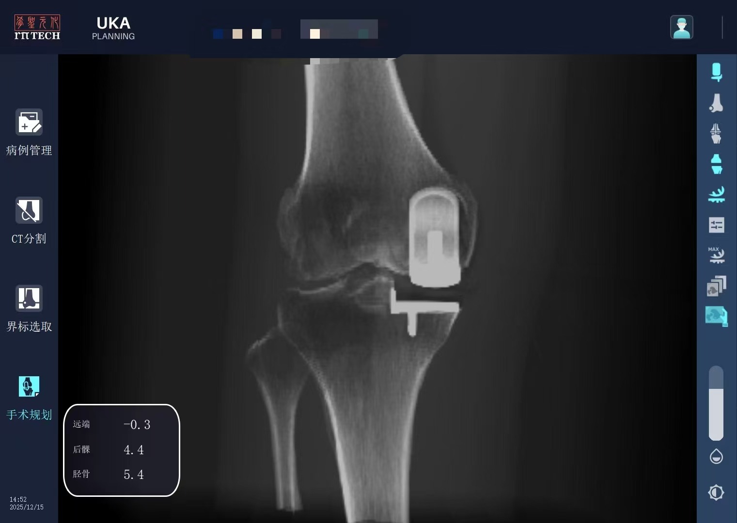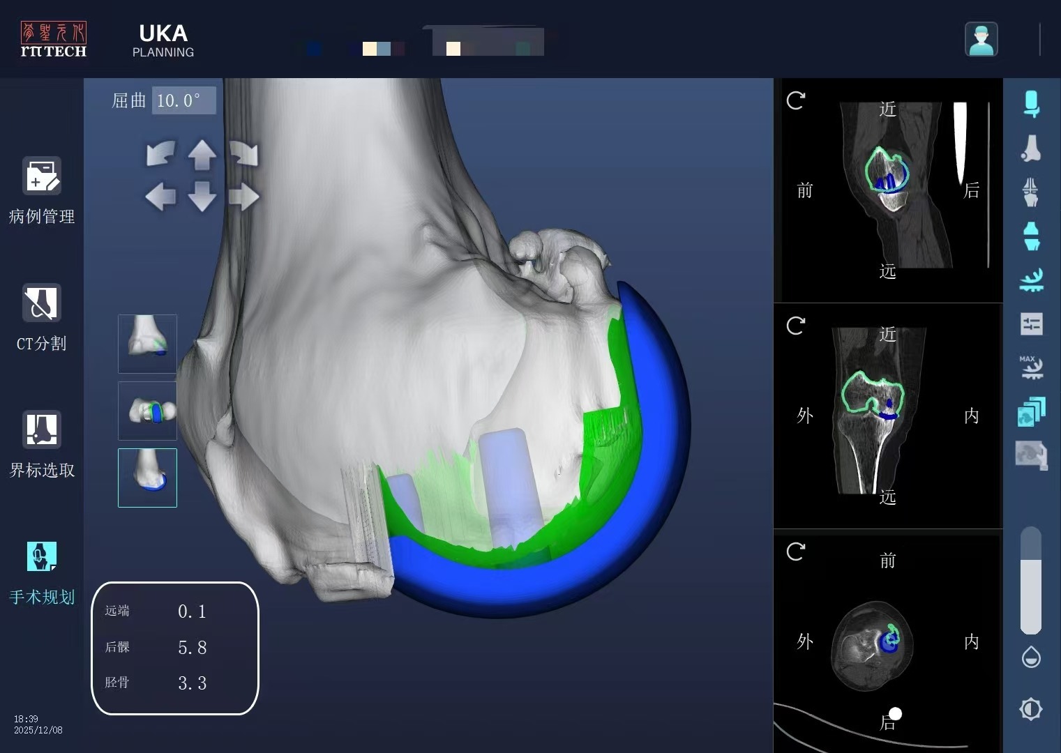 据介绍,活动平台单髁置换术是关节外科领域的技术难点之一,对假体定位精度、软组织动态平衡及垫片运动轨迹控制要求极为严苛,传统手工操作高度依赖医生经验,存在垫片脱位、力线偏移等风险。为攻克这一临床痛点,元化智能研发团队与一线骨科专家深度协同,基于真实手术痛点,对锟铻®单髁模块进行专项功能升级,集成术中软组织张力动态反馈、活动垫片运动轨迹模拟、亚毫米级假体实时定位控制等核心技术,实现机器人系统对活动平台单髁假体的精准辅助植入。