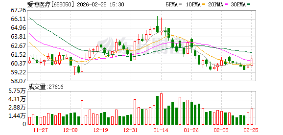 截至2月25日收盘,爱博医疗报60.96元/股,涨幅1.5%,市值118亿元。